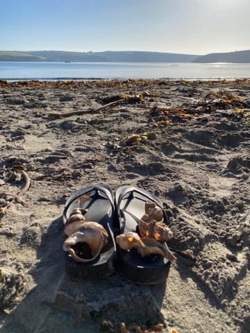 The water was crystal clear and there, winking at me from the sandy bottom, I spied some cool curly shells that swayed with the waves – within reach too – wahoo. I came home with more treasures, not driftwood this time either.